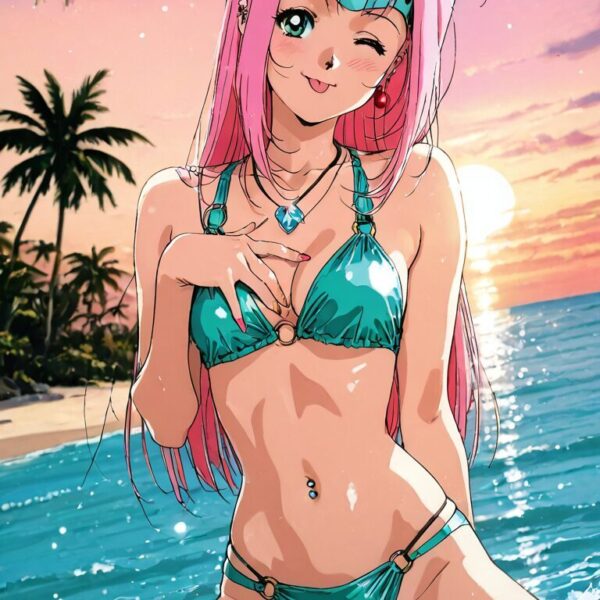 最高品質, 傑作, 超高解像度, (現実的:1.4), (クローズアップポートレート) RAW写真, 1 女の子, 22才, 傑作, 現実的 pictures, 日本の写真, 富士ネガフィルム, 飽和, 対比, ポカリスエット広告 ((小さい胸)),((歯を見せて笑う)),ポニーテールとヘアタイ、ビキニ、グラビア